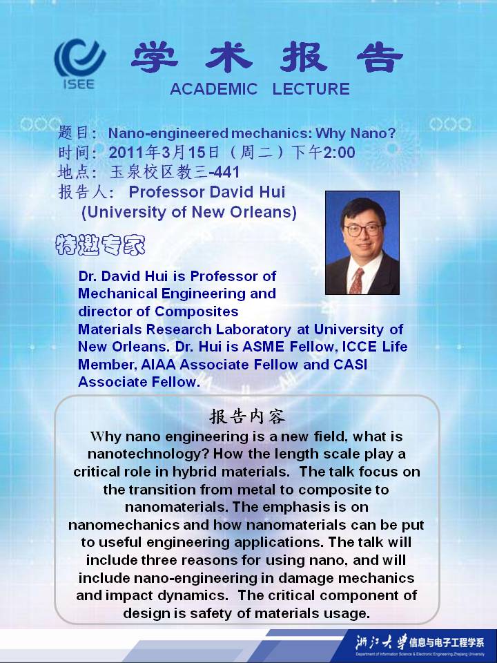 報告人簡介:Dr. David Hui is Professor of Mechanical Engineering and director of Composites Materials Research Laboratory at University of New Orleans. He received his Ph.D. from University of Toronto in Aerospace Engineering. Dr. Hui has edited over 35 widely cited books, as evidence in the Google Search showing over 14000 citations. Other books includes, editor of Army Research Office workshop "Dynamics of Structures" proceedings, ICCE/1-17, SES, ASME books and numerous special issues of journals, and served as numerous keynote lecturers. He has served as founder and editor-in-chief of one of the most prestigious journals in composite materials, Composites B Engineering journal. This journal has consistently ranked second or third among all composite materials journals in terms of impact factors. Curently, he serves on the editorial board of 28 international journals, seven of them are nano journals, and the rest are mostly composite materials journals. Dr. Hui is currently ASME Fellow, ICCE Life Member, AIAA Associate Fellow and CASI Associate Fellow. Dr. Hui was awarded The Ohio State University Research Award, ASME Pressure Vessels and Piping Certificate of recognition, ASME Ralph James Award (ASME Petroleum Division), NASA Certificates of Recognition, ASME ETCE Service Awards, the University of New Orleans Alumni (lifetime) Career Research Achievement Award and the University of New Orleans, University Research Professor. Dr. Hui is the chairman of ICCE, which has grown to be the world's pre-eminent annual "technical" composite materials or nano-materials conference.