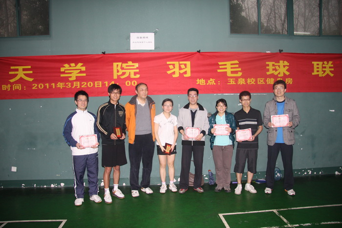 經(jīng)過近三個小時的激烈角逐,楊校長和力學(xué)系博士生潘杉杉(女)的組合以及戴志潛和航空航天系碩士生啜俊娜(女)的組合順利打進決賽。決賽中,兩對選手都顯示出高超的水平與不凡的實力,羽毛球館的師生們紛紛被吸引到?jīng)Q賽場地周圍觀戰(zhàn)。經(jīng)過三局的激烈爭奪,戴志潛和啜俊娜組合以微弱的優(yōu)勢取勝,楊校長和潘杉杉組合屈居亞軍。解利軍和鄭建靖組合、李華和饒正組合并列獲得季軍。比賽結(jié)束后,學(xué)院黨委吳丹青書記為獲獎選手頒發(fā)了證書和獎品。獲獎同學(xué)紛紛找楊校長合影留念。