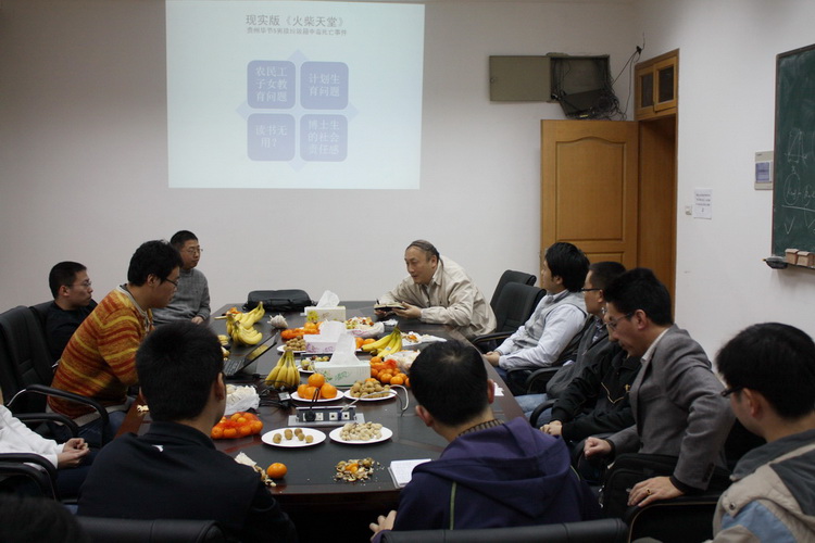 支部書記王鵬博士首先通過近期貴州畢節五名流浪兒的悲劇,配以生動的幻燈片和音樂,提出了農民工子女教育和安全等問題;李鐵風老師結合新聞圖片談了湖南老家農村空心化,村容凋敝的問題;李倩倩博士提出了對留守兒童群體的諸方面擔心;龔博、馮瓊、胡?P、金濤等博士由圍繞新聞就計劃生育、城鄉教育設施和水平差異以及農村教育重男輕女等議題發表了自己的看法;董臣令、張逸塵等博士認為應該加大社會保障特別是底層弱勢群體的保障力度;徐明、黃洋博士就民工子女的異地教育和安全管理問題給出了自己的意見;董策舟、單曄杰、劉德重等博士認為加大教育和科研投入十分必要,駁斥了社會上一度盛行的“讀書無用論”;王鵬博士補充說教育應該多元化,尤其在欠發達地區,更應該讓家庭轉變傳統觀念,加大職業教育的投入。