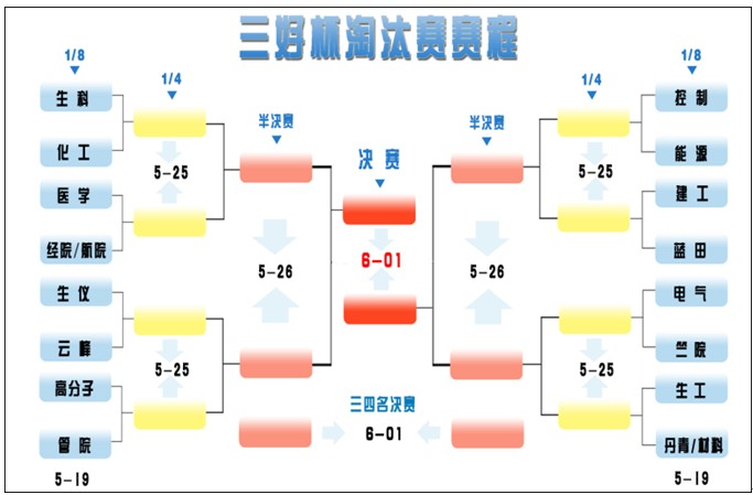 本屆杯賽的淘汰賽對陣形勢,附加賽“航院/經(jīng)院”的勝者將作為十六強(qiáng)對陣醫(yī)學(xué)。
