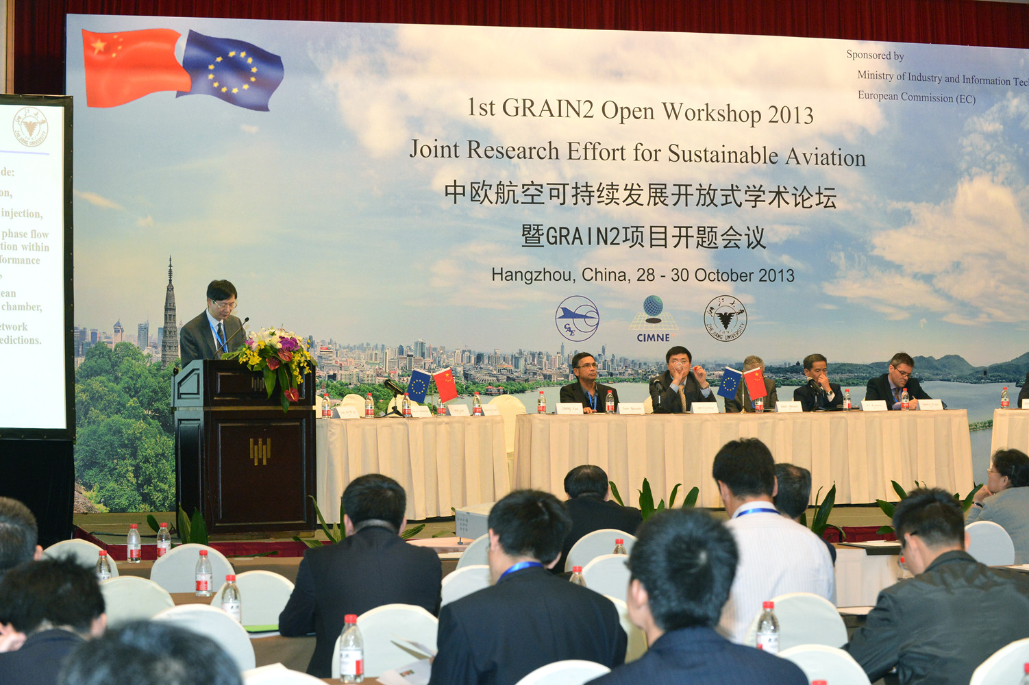 浙江大學黨委副書記嚴建華、歐盟駐華使團科技參贊Philippe Vialatte、中國工業和信息化部裝備工業司航空處調研員石靖敏、工程中數值方法國際中心(西班牙)教授Gabrel Bugeda、中國航空研究院常務副院長魏金鐘參加會議并致開幕辭。開幕式由中國航空研究院處長孫健和工程中數值方法國際中心(西班牙)教授Jacques Periaux共同主持。中國航空研究院副院長華俊、空客北京工程技術中心總經理Pedro Fernández-Rodríguez、北京大學副校長陳十一做了引言報告。