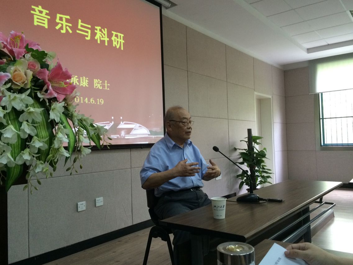 2014年6月19日下午,中科院力學所吳承康院士在玉泉校區教五333報告廳作了題為“音樂與科研”的講座。航空航天學院黨委副書記戴志潛,團委副書記秦婧雅以及各級本科生及研究生參加了此次講座,聆聽吳院士對科研和音樂的獨到見解。