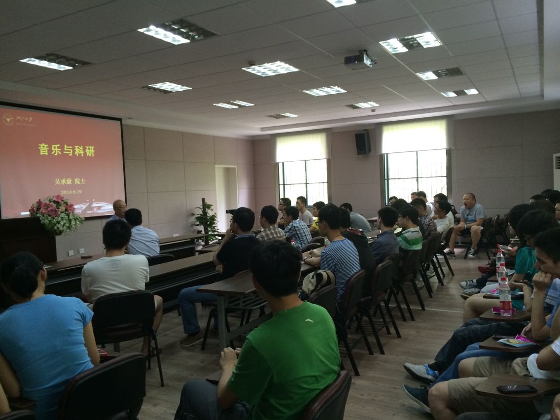 2014年6月19日下午,中科院力學所吳承康院士在玉泉校區教五333報告廳作了題為“音樂與科研”的講座。航空航天學院黨委副書記戴志潛,團委副書記秦婧雅以及各級本科生及研究生參加了此次講座,聆聽吳院士對科研和音樂的獨到見解。