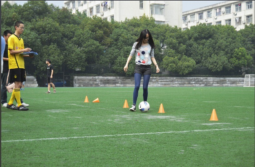 此次比賽分為兩個部分:足球娛樂活動和足球賽正式比賽。首先進行的是足球娛樂活動——繞樁射門。在一片歡樂之中,參賽的各位球員展示了自己的速度和技術,尤其是女子組中,常若菲和雷軍霞兩位同學,那一撥,一帶,一射,有板有眼,更是巾幗不讓須眉。