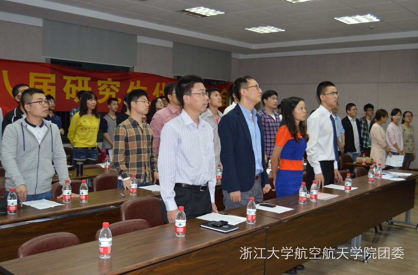 在激昂的國歌聲中大會拉開了序幕。李宇斌同學首先介紹了大會的籌備情況。浙江大學研究生會主席代?F代表浙江大學研究生會致辭,他希望學院研博會進一步加強與學校研究生會、博士生會以及全體研究生的溝通,更加深入地了解學生的需求,更好地成為連接校院、導師和同學們之間的紐帶;他同時還預祝航空航天學院第八次研究生代表大會成功舉行。