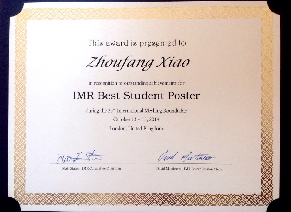 網(wǎng)格生成是數(shù)值模擬的主要性能瓶頸和最重要的支撐技術(shù)之一,歷經(jīng)數(shù)十年發(fā)展,已成為一個(gè)獨(dú)立的研究領(lǐng)域。IMR是網(wǎng)格生成領(lǐng)域影響最大的國際學(xué)術(shù)會(huì)議,由美國三大國家實(shí)驗(yàn)室之一Sandia國家實(shí)驗(yàn)室組織,始于1992年,每年一屆。IMR設(shè)有若干競賽單元。在海報(bào)單元,會(huì)議指導(dǎo)委員會(huì)(Steering Committee)依據(jù)所解決的技術(shù)問題、方案的創(chuàng)新性、方案對整個(gè)領(lǐng)域的影響以及海報(bào)的質(zhì)量等4項(xiàng)標(biāo)準(zhǔn),結(jié)合參會(huì)人員評分,在所有學(xué)生參賽作品中確定最佳學(xué)生海報(bào)獎(jiǎng)(僅1位)。在網(wǎng)格生成競賽單元,會(huì)前主辦方公布標(biāo)準(zhǔn)幾何模型,所有來自學(xué)術(shù)界(利用自研程序)和商業(yè)軟件公司(利用商業(yè)程序)的參賽者以該模型為輸入生成網(wǎng)格,向指導(dǎo)委員會(huì)提交結(jié)果數(shù)據(jù)和網(wǎng)格生成方案,指導(dǎo)委員會(huì)依據(jù)方案的原創(chuàng)性、網(wǎng)格生成的復(fù)雜性、網(wǎng)格質(zhì)量以及方案的實(shí)用性等4項(xiàng)標(biāo)準(zhǔn)確定最佳方案獲得者(僅1位)。包括我校提交的方案在內(nèi),今年共有美國Pointwise公司、法國INRIA實(shí)驗(yàn)室、美國CD-adapco公司以及英國宇航系統(tǒng)公司(BAE Systems)公司等5家單位參與此單元競賽。