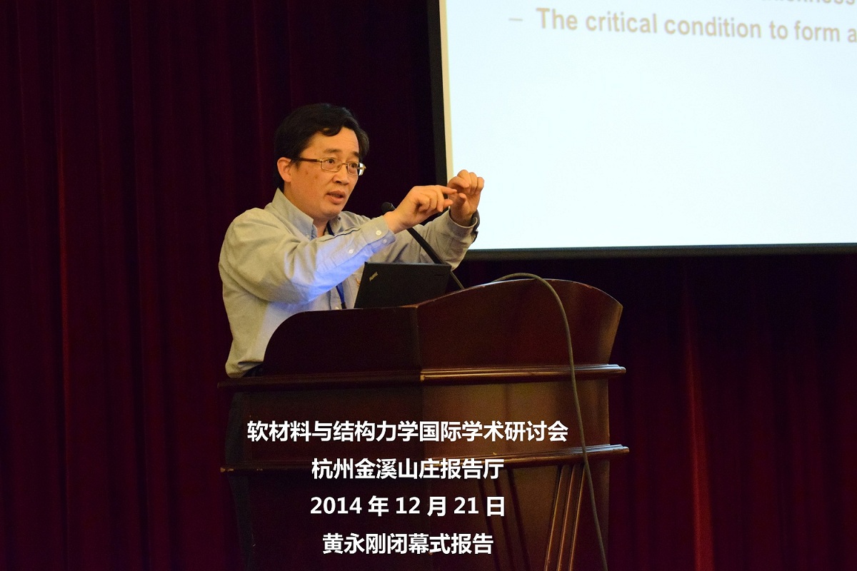 2014年12月20至22日,由浙江大學軟物質科學研究中心、浙江大學航空航天學院和浙江省力學學會主辦的“軟材料與結構力學國際學術研討會(International Workshop on Mechanics of Soft Materials and Structures)”在杭州成功舉辦。本次會議由美國西北大學講座教授、浙江大學光彪講座教授、浙江大學軟物質科學研究中心主任黃永剛和浙江大學航空航天學院錢勁研究員、宋吉舟教授擔任共同主席。美國國家工程院院士、布朗大學講座教授高華健,西北大學黃永剛教授,和來自香港大學、香港理工大學、清華大學、北京大學、西安交通大學等20多家科研院所的專家、代表和學生共110余人參加了本次研討會。