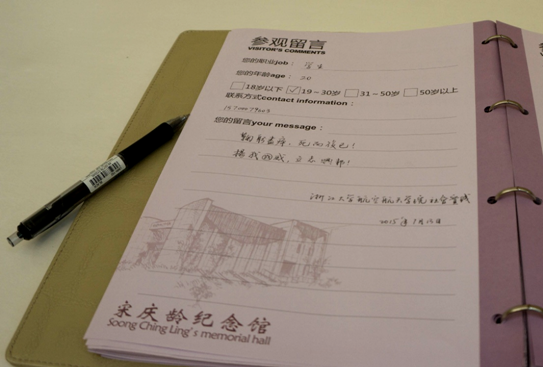 參觀宋慶齡紀念館后留言:“鞠躬盡瘁,死而后已!揚我國威,立志興邦!——浙江大學航空航天學院社會實踐團”