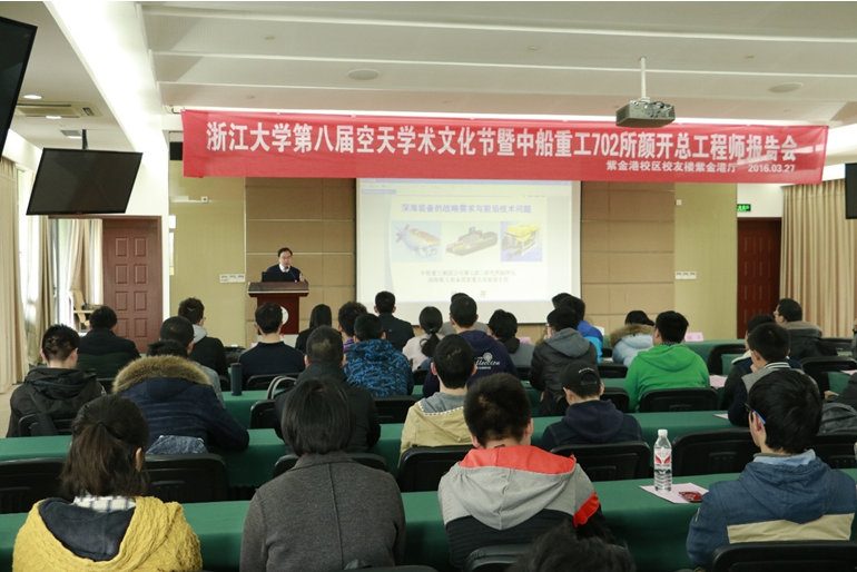 327日下午15:00,航空航天學院第八屆空天學術文化節開幕式在浙江大學紫金港校區校友樓紫金港廳舉行。開幕式非常榮幸地邀請到了中國船舶重工集團公司第702研究所副所長顏開教授做報告,學院常務副院長邵雪明、學院黨委副書記戴志潛、團委副書記秦婧雅等出席開幕式暨報告會。活動由院學生會主席肖瑤主持,共有70余位師生參加了本次活動。