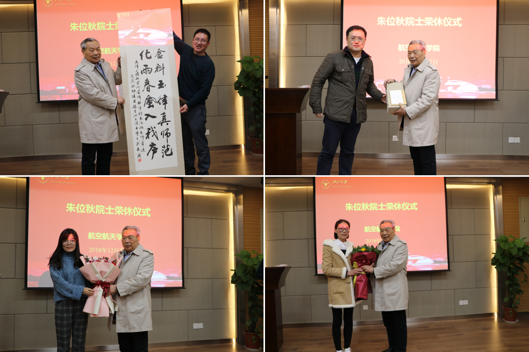 朱院士感慨萬千,在發(fā)表榮休感言時,他由衷地感謝浙大、感謝航院、感謝前來參加榮休儀式的每一位師生。他分享了在浙大工作43年來的點(diǎn)點(diǎn)滴滴,并談了四點(diǎn)體會:一是人生的道路上會有很多岔路口,我們一定要選擇好適合自己的方向。二是要培養(yǎng)好的學(xué)生,一定要有好的教師來上課,要重視教學(xué)工作。三是要真正做好學(xué)問,必須要有自己的學(xué)術(shù)思想,去發(fā)明、發(fā)現(xiàn)和創(chuàng)造。四是年輕教師要積極與國際知名教授開展合作。他還語重心長地說,“希望航院教師能夠把學(xué)問做好,把課上好。”最后,他還表示,仍然會一如既往地關(guān)心支持學(xué)院發(fā)展。