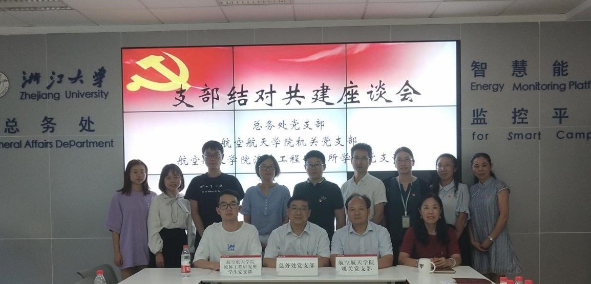 2019年9月20日下午,航空航天學(xué)院機(jī)關(guān)黨支部、流體工程研究所研究生黨支部與我校總務(wù)處黨支部在紫金港校區(qū)納米樓舉行結(jié)對(duì)儀式,并通過(guò)座談?dòng)懻撓嚓P(guān)事宜。總務(wù)處黨支部書(shū)記朱宇恒及支委成員、航空航天學(xué)院黨委書(shū)記畢建權(quán)及機(jī)關(guān)黨支部支委成員、流體工程研究所研究生黨支部書(shū)記劉炳瑞及支委成員參與座談。