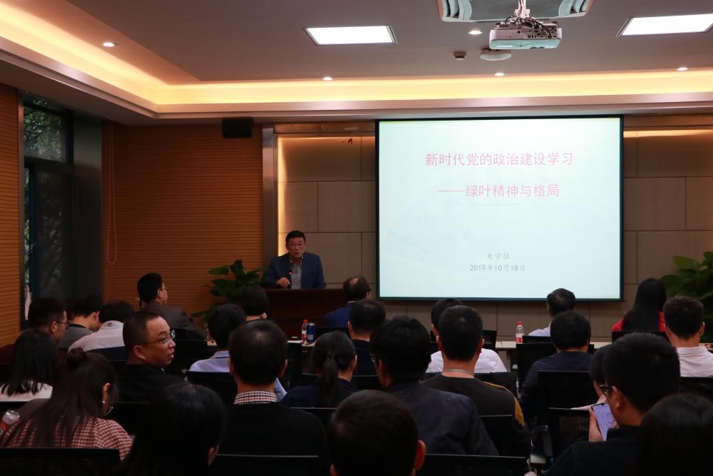 隨后,總務處黨支部書記朱宇恒上臺講解了主題為“新時代黨的政治建設學習――綠葉精神與格局的黨課報告,朱老師強調了新時代黨的政治建設的首要任務和舉措,要堅定“兩個維護”,做到增強“四個意識”、堅定“四個自信”、堅持“四個服從”;同時強調了新時代黨的政治建設的統領地位。在最后,朱老師提倡在工作學習中我們要堅持綠葉精神,樂于奉獻,忠誠擔當。