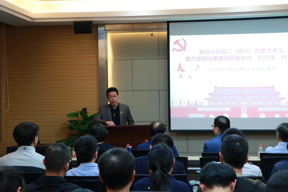 最后,由航空航天學院黨委副書記、紀委書記戴志潛老師上臺為大家講黨課,戴老師結合自己的工作經歷,細致的為大家解讀修訂《中國共產黨紀律處分條例》的重大意義,就是著力提高紀律建設的政治性、時代性、針對性。戴老師詳細的講解了《條例》的有關內容,特別指出《條例》最鮮明的特點就是進一步細化和嚴明了政治紀律和政治規矩,把紀律建設的政治性提升到了一個新高度。