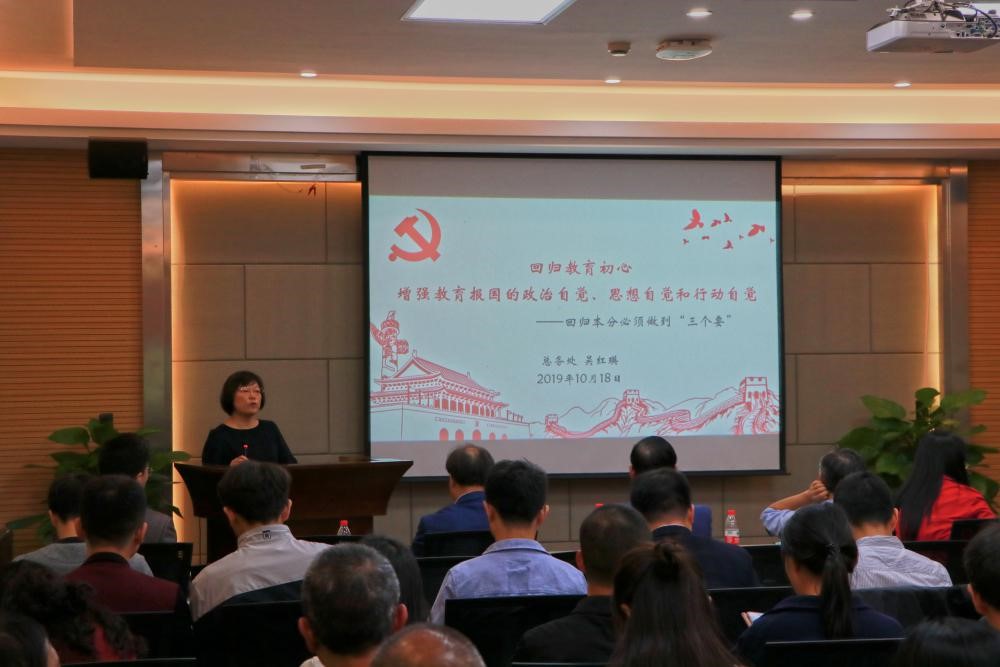 吳紅瑛處長首先上臺為大家上黨課,吳處長結合自己曾經在教學一線的教學經歷以及作為一名學生家長的經歷,講述了主題為“回歸教育初心――增強教育報國的政治自覺、思想自覺和行動自覺”的主題報告,吳處長在報告中指出要做到考核評價導向正確,解決指揮棒問題;堅持把教師隊伍建設作為基礎工作,解決教育者本身的問題;努力構建德智體美勞全面培養的教育體系,解決重知識傳教,輕能力素質和人格培養的問題。