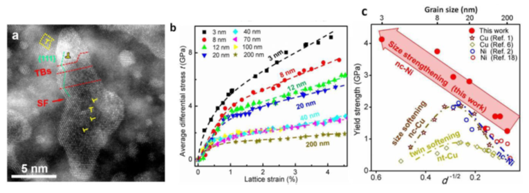 在此次研究中,上海高壓科學研究中心的周曉玲博士和許家寧博士利用金剛石壓砧(diamond anvil cell)和徑向X射線衍射方法,測量在高壓環境中多種晶粒尺寸的純金屬鎳的偏應力隨晶格應變的變化關系、以及屈服應力與晶粒尺寸的定量關系,如圖1所示,發現超細金屬鎳(晶粒尺寸為3nm)的屈服強度達到4.2GPa,是常用金屬鎳的10倍,最大流應力可以達到10.2GPa;重慶大學材料科學與工程學院的馮自強博士等通過掃描電鏡觀察到在3nm晶粒內部存在的位錯、層錯和孿晶。