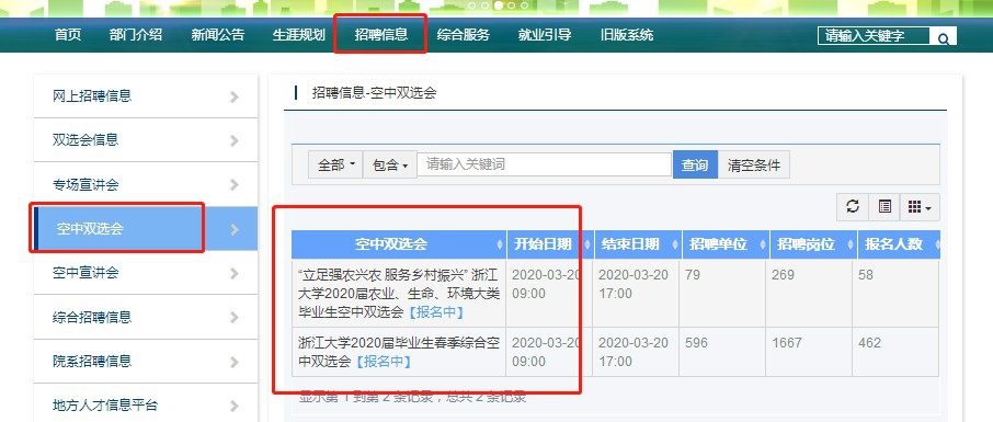 方法 2:點擊就業網首頁“招聘信息-空中雙選會”選擇希望參加的招聘會。