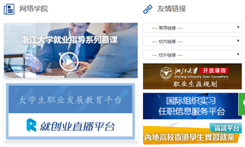 在線學習:浙江大學就業指導中心網站http://www.career.zju.edu.cn主頁下方“就業指導系列慕課http://www.career.zju.edu.cn/jyxt/jyweb/webIndex.zf”、“就創業直播平臺http://zju.wnssedu.com/”、“職業生涯規劃http://ocw.zju.edu.cn/portal/site/zygh”登錄(統一身份認證登錄)后即可學習生涯規劃、就業指導、創業準備等方面的網絡課程,也可以進行個人職業測評。