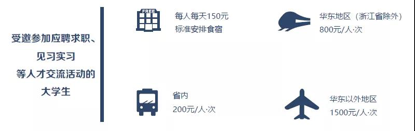 1.大學生來紹參加人才交流活動補貼受邀參加應聘求職、短期實習(不超過1個月)等人才交流活動的高校在校生,給予200—1500元交通補貼,并按每人每天150元標準安排食宿。