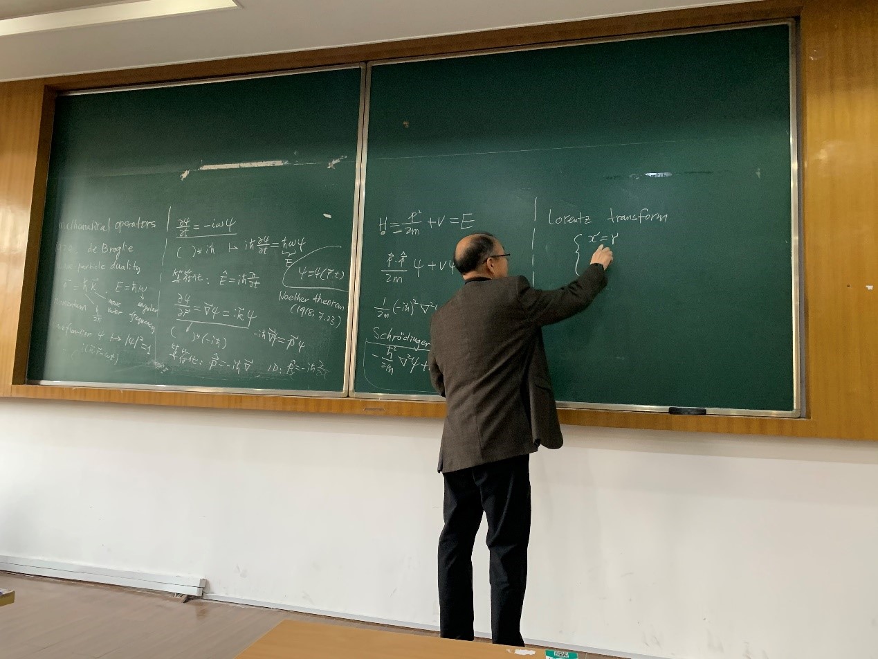 12月24日下午,趙亞溥教授空手上了講臺,拿起粉筆和黑板擦就開始了連續近3小時的授課。他主要圍繞近代物理對經典力學框架的補充和更高視角下的經典力學兩個方面展開:從波函數入手,通過引入算符的概念,由能量守恒導出了薛定諤方程;從狹義相對論的洛倫茲變換講到群與諾特定理,討論了質量守恒與質量-能量對稱的關系,再抽象到流形與度量;最后介紹了麥克斯韋方程組與經典場論的內容。趙教授風趣幽默,寓教于樂,在概念講解和公式推導期間不時地穿插古今力學家的逸聞軼事,引得臺下師生會心一笑。這堂課在輕松融洽的氛圍中畫上了圓滿的句號。