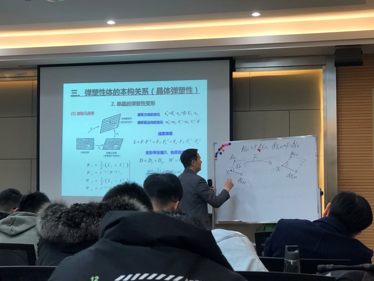 12月27日下午,王建祥教授在白板上開始了從超彈性到低彈性的演繹。他主要講授了超彈性、熱彈性、熵彈性幾個主題:從熱力學第一定律入手,通過自由能進行簡化;從無規行走引出熵與彈性的關系;討論了傅里葉傳熱定律的適用性問題,并由此談到了非局部的廣義熱彈性理論;最后介紹了塑性本構與位錯、滑移的內容。王建祥教授循循善誘、信手拈來,在推導中力求把變量之間的關系簡明地闡述出來,在內容上將傳統理論和研究進展有機結合起來,讓同學們在掌握基礎知識的同時也拓寬了視野。