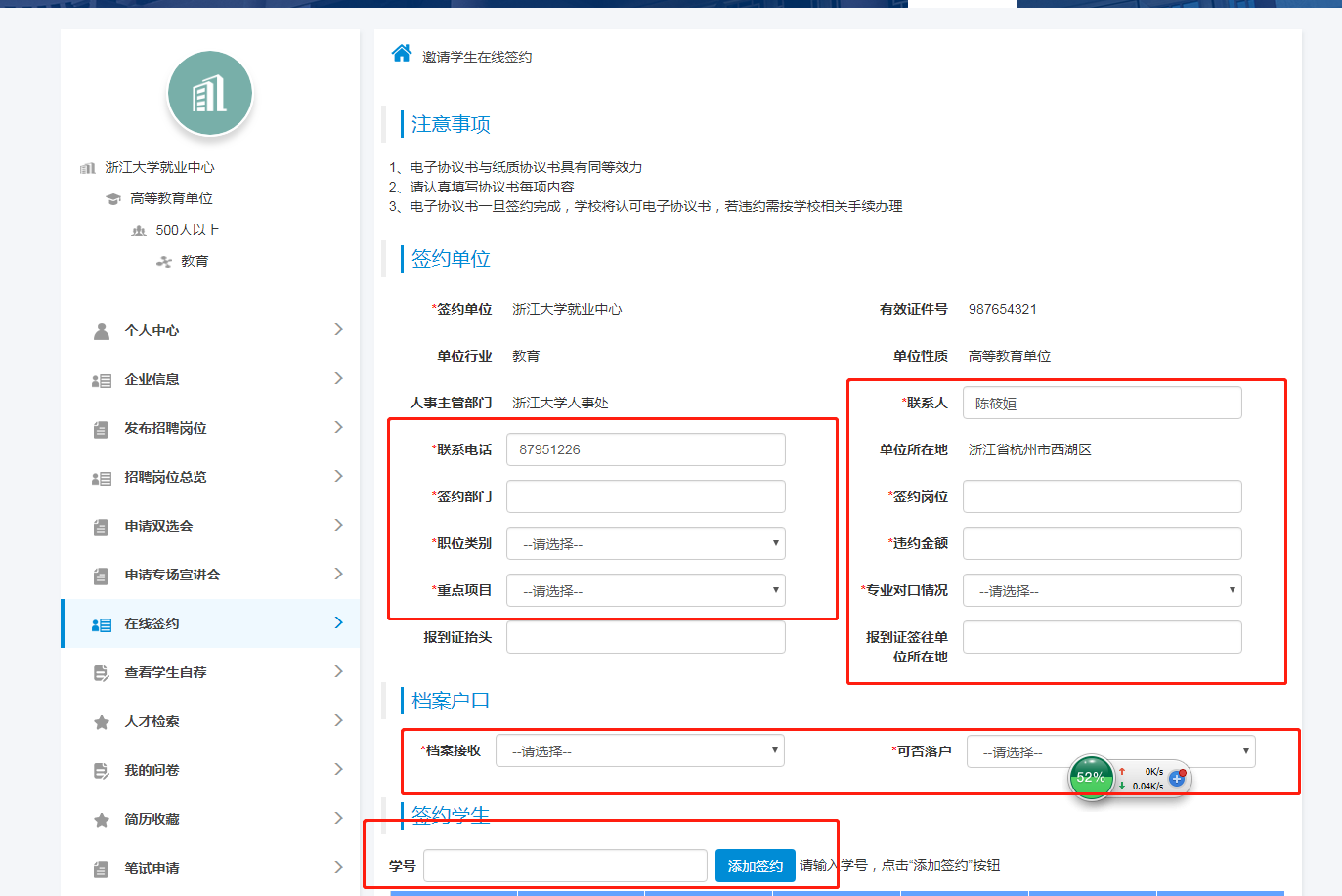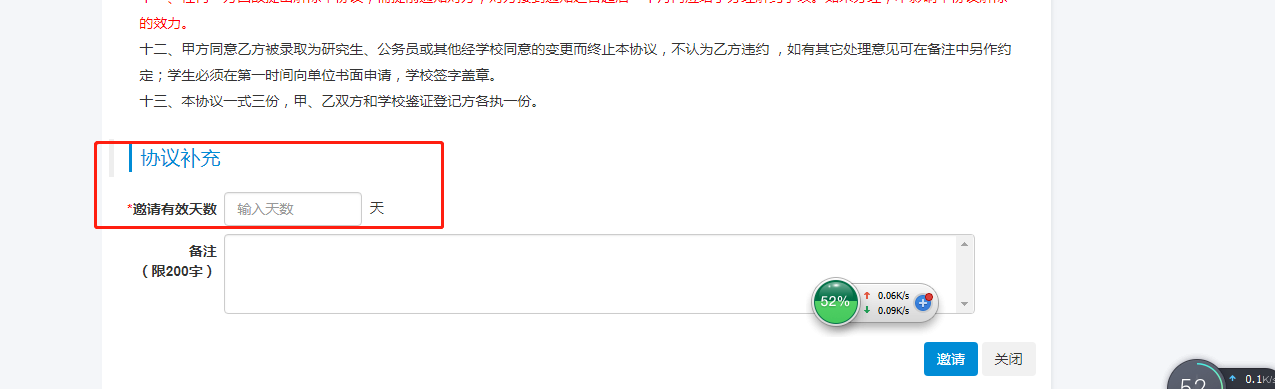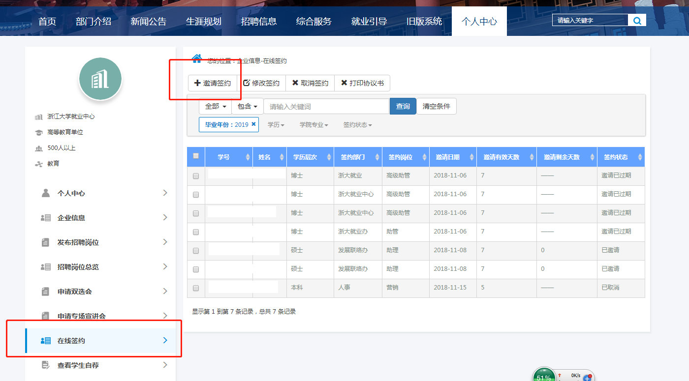 四、完善簽約相關信息,輸入學生學號進行邀約,可設定邀約的有效期限。點擊“邀約”,完成網上三方協議書的簽訂。