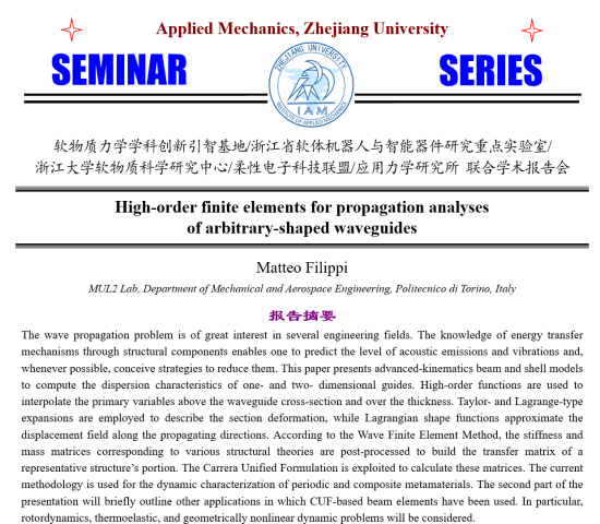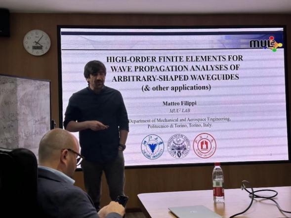 緊接著,Filippi助理教授作了題為“High-order Finite Elements for Propagation Analyses of Arbitrary-Shaped Waveguides”的學(xué)術(shù)報(bào)告。他指出,波動(dòng)傳播問題在多個(gè)工程領(lǐng)域具有關(guān)鍵研究?jī)r(jià)值——通過揭示結(jié)構(gòu)部件中的能量傳遞機(jī)制,可以預(yù)測(cè)聲發(fā)射水平和振動(dòng)強(qiáng)度,并據(jù)此設(shè)計(jì)有效的減振策略。他提出了一種基于先進(jìn)運(yùn)動(dòng)學(xué)的梁和殼模型,用于計(jì)算一維和二維波導(dǎo)的頻散特性,具體方法是在波導(dǎo)的橫截面和厚度方向上采用高階函數(shù)對(duì)主變量進(jìn)行插值。該模型采用泰勒型和拉格朗日型展開描述截面變形,同時(shí)利用拉格朗日型函數(shù)在傳播方向上近似位移場(chǎng)。