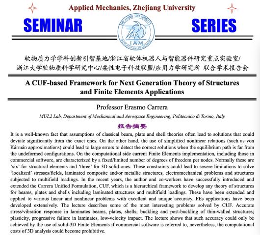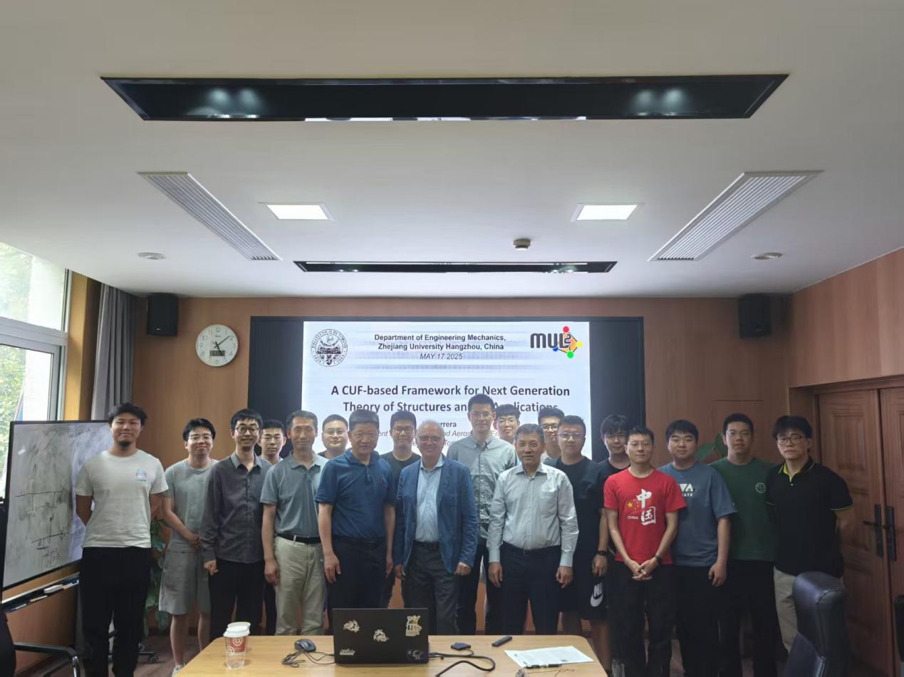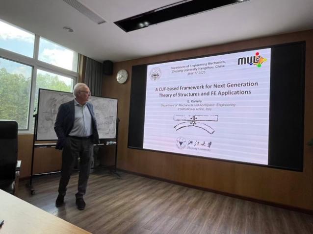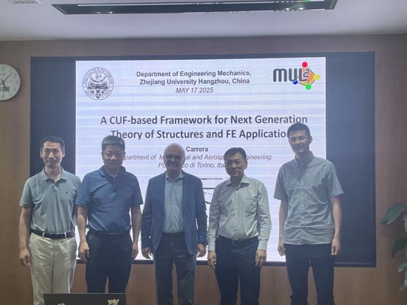 意大利都靈理工大學(xué)(Politecnico di Torino)Erasmo Carrera 教授(都靈科學(xué)院院士、意大利航空航天學(xué)會(huì)主席)、Enrico Zappino副教授和Matteo Filippi助理教授一行,應(yīng)浙江大學(xué)應(yīng)用力學(xué)研究所邀請(qǐng),于2025年5月14日和17日分別訪問浙江大學(xué),并與浙江大學(xué)航空航天學(xué)院、建筑工程學(xué)院,以及來自香港城市大學(xué)、浙江農(nóng)林大學(xué)、沈陽大學(xué)的師生,以及來自校外研究機(jī)構(gòu)和企業(yè)的工程師、技術(shù)負(fù)責(zé)人進(jìn)行了廣泛的學(xué)術(shù)交流與討論。