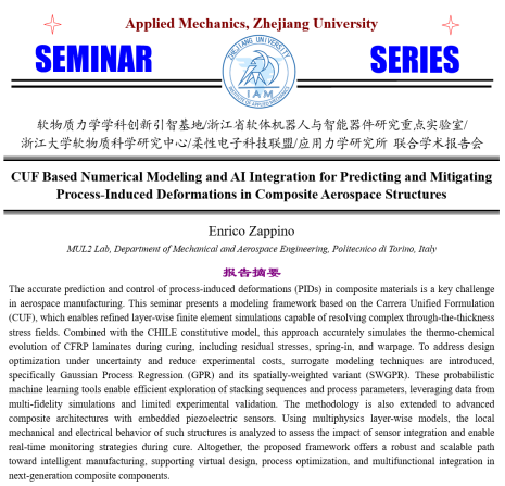 5月14日下午,Zappino副教授在題為“CUF Based Numerical Modeling and AI Integration for Predicting and Mitigating Process-Induced Deformations in Composite Aerospace Structures”的學(xué)術(shù)報(bào)告中指出,精確預(yù)測(cè)與控制復(fù)合材料中的工藝誘導(dǎo)變形(PIDs)是航空航天制造領(lǐng)域的關(guān)鍵挑戰(zhàn)。報(bào)告介紹了一種基于CUF的建模框架,該框架通過精細(xì)化分層有限元模擬,能夠解析厚度方向的復(fù)雜應(yīng)力場(chǎng)。結(jié)合CHILE本構(gòu)模型,可準(zhǔn)確模擬碳纖維增強(qiáng)聚合物(CFRP)層壓板在固化過程中的熱化學(xué)演化過程,包括殘余應(yīng)力、回彈變形和翹曲現(xiàn)象。