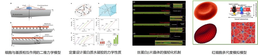 建立了細胞與基質相互作用的二維力學模型和細胞遷移模型;揭示了絲蛋白β片納米晶體的強韌化機制;證實了蛋白質水凝膠的力學性質可以在單個蛋白質水平上進行精確定量設計;發展了紅細胞多尺度模擬的方法等;開展了與生物、化學、醫學深度融合交叉合作,系列成果在PRL、JMPS、Nat Commun、Adv Mat、PNAS、 Nano Lett等期刊發表,獲得學術界廣泛關注和認可。