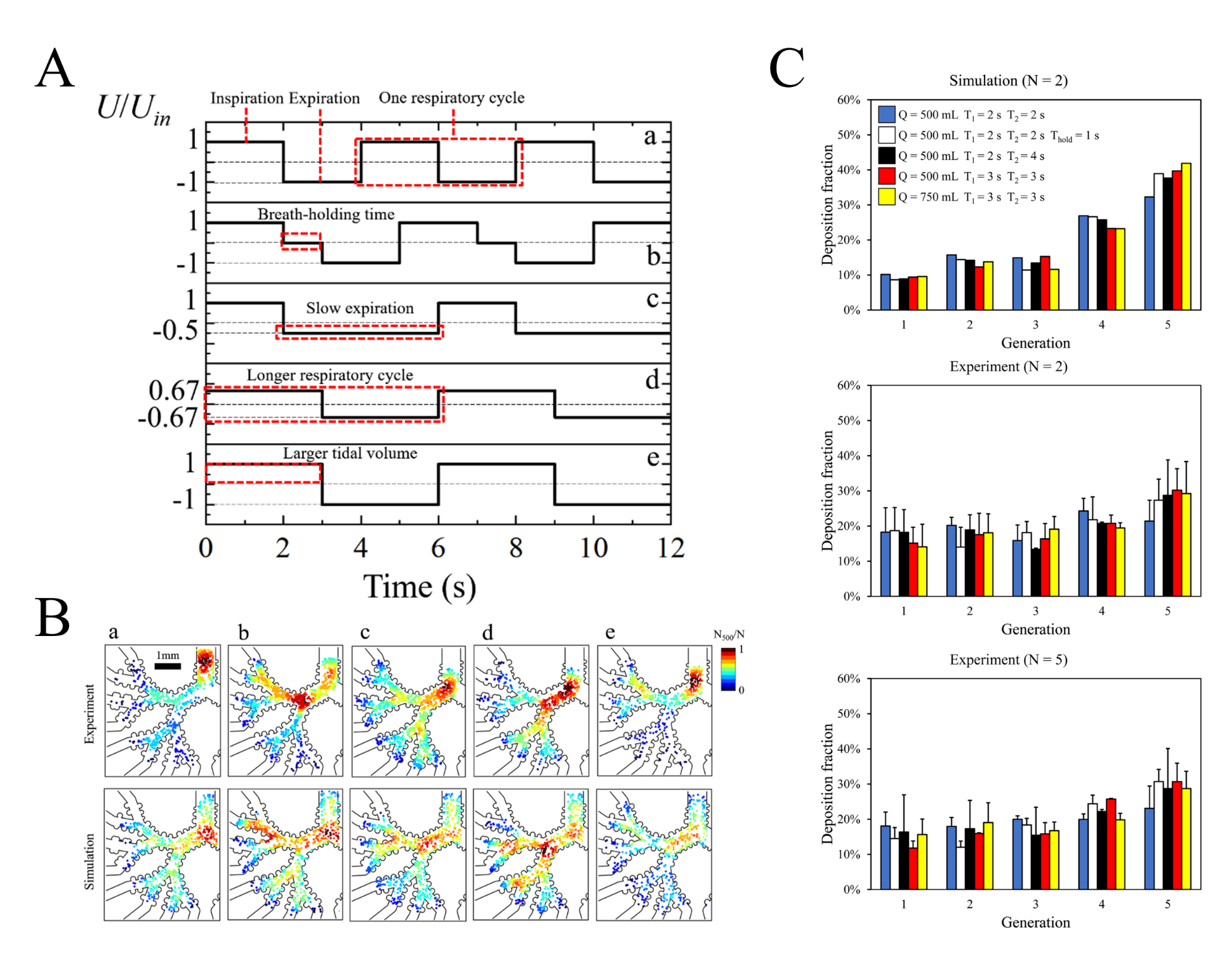 研究人員進一步研究了不同的呼吸模式對可吸入顆粒物的沉積影響,發現通過增加屏息時間、延長呼氣時間、延長呼吸周期和增大呼吸潮氣量等方式,可增加顆粒在芯片通道中的停留時間,從而促進顆粒向肺部更深處的沉積(圖2)。這些發現對于理解顆粒在肺部的沉積過程以及藥物傳遞的優化具有重要意義。