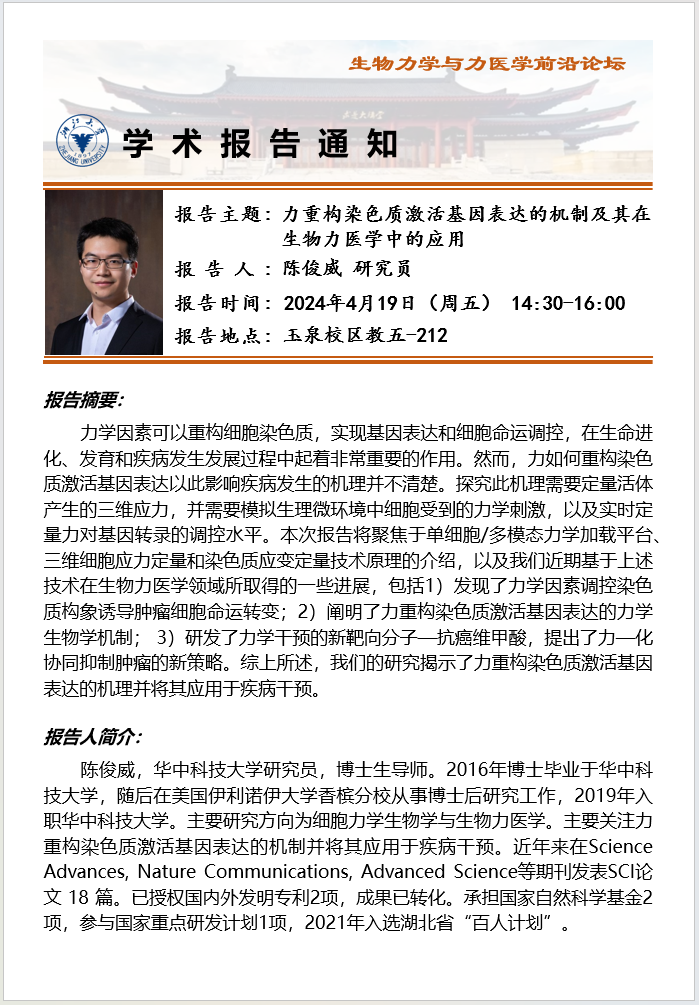 2024年4月19日華中科技大學陳俊威研究員學術報告通知