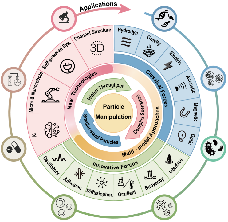 在快速發展的微流控領域,顆粒操控技術正逐漸成為跨學科應用的關鍵技術。利用精確管理微量液體和單芯片多系統集成的能力,其涉及在流體環境中對微納米尺度的實體進行有效控制和引導。精準操控循環腫瘤細胞、細胞外囊泡、化學試劑以及各種其他顆粒對于高通量篩選、疾病診斷及細胞水平的生物學研究至關重要。將顆粒操控技術整合到芯片實驗室系統,可為現場快速診斷、個性化醫療和便攜式分析系統帶來新的范式。