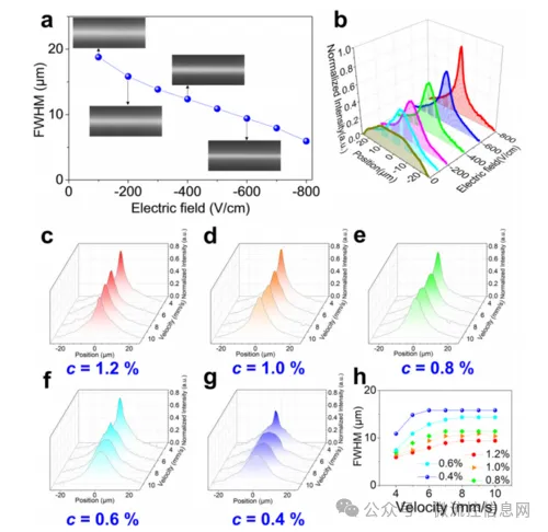 圖4系統研究了電場強度、流速和PEO溶液濃度這三個關鍵因素對納米顆粒聚焦效果的影響。通過一系列實驗數據,展示了不同電場強度下納米顆粒聚焦的熒光強度分布和半高寬變化,表明電場強度的增加可顯著改善聚焦效果;同時,分析了不同流速和 PEO 濃度組合下的聚焦性能,發現 PEO 濃度在一定范圍內對聚焦效果有顯著影響,過高或過低的濃度均不利于納米顆粒聚焦。該圖通過量化分析為優化納米顆粒操控條件提供了重要參考。