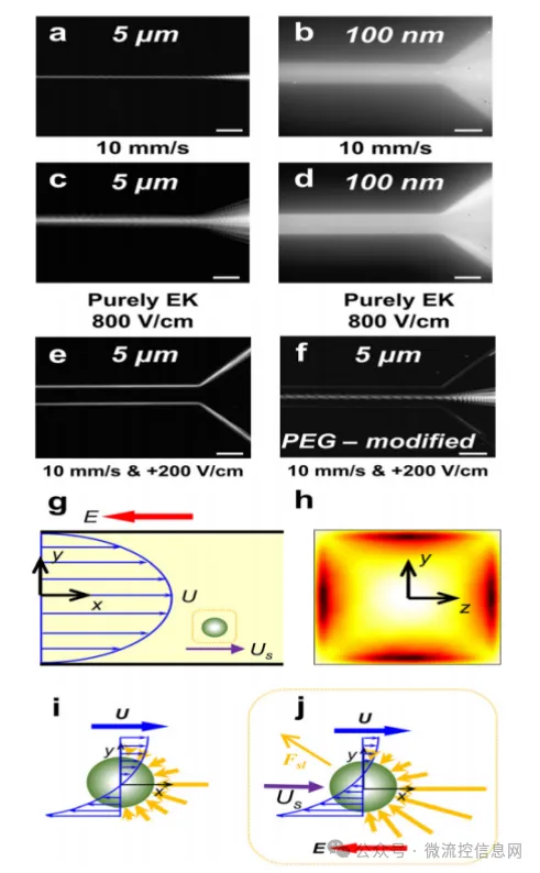 實驗參數優化與納米顆粒操控:通過系統實驗,研究團隊優化了電場強度、流速和聚乙二醇(PEO)溶液濃度等關鍵參數。實驗結果表明,適當調整這些參數可以顯著改善納米顆粒的聚焦效果。在優化條件下,驗證了該方法對不同尺寸納米顆粒的高效操控能力。