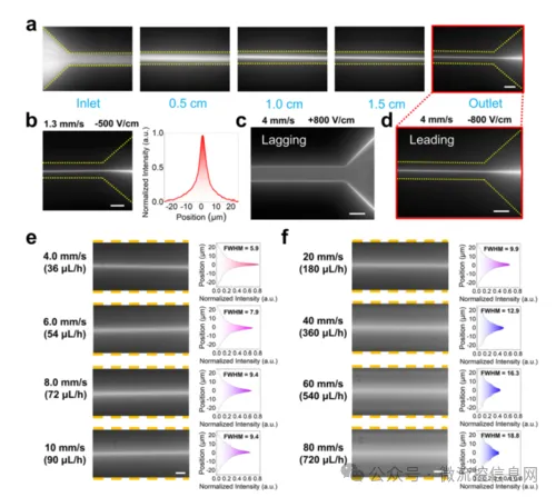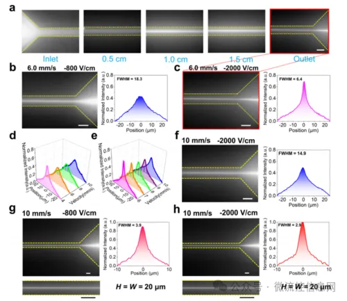圖2呈現了在優化條件下,100 nm 納米顆粒在大尺寸微通道中的高通量聚焦過程及效果。通過熒光成像技術記錄了納米顆粒從均勻分布到逐步向通道中心聚焦的動態過程,展示了不同位置的熒光圖像,以及在不同流速和電場強度下聚焦效果的量化分析。結果表明,適當調整電場方向和強度可有效驅動納米顆粒遷移并實現聚焦,且聚焦效果隨電場強度增加而顯著提升,為納米顆粒的高效操控提供了實驗依據。