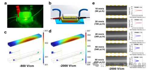 圖5聚焦于高電場下焦耳熱對納米顆粒聚焦的影響及其控制方法。通過模擬和實驗展示了不同電場強度下微通道內的溫度分布,揭示了焦耳熱引起的溫度升高對納米顆粒聚焦的潛在負面影響。進一步通過干冰冷卻系統實現了對芯片溫度的有效控制,并在高電場條件下展示了納米顆粒的聚焦效果,證明了溫度控制策略可顯著提升納米顆粒聚焦的效率和穩定性,為高通量納米顆粒操控提供了可行的熱管理方案。