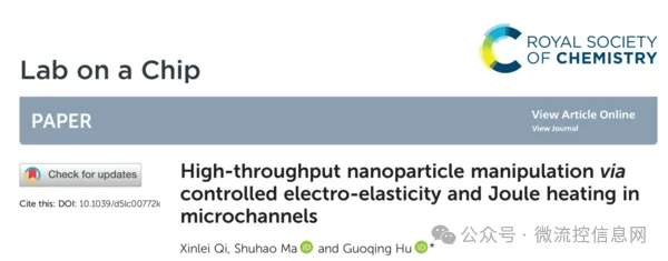 浙江大學胡國慶教授團隊提出了一種基于微流控技術的納米顆粒操控方法,通過結合電場和非牛頓流體的粘彈性特性,實現了高通量、精準的納米顆粒聚焦和富集。該方法通過優化電場強度、流速和聚合物濃度等參數,克服了傳統方法的局限性,并通過溫度控制有效解決了高電場下的焦耳熱問題,為納米顆粒的高效操控提供了一種新的途徑,具有重要的科學意義和應用前景。該研究成果以“High-throughput nanoparticle manipulation via controlled electro-elasticity and Joule heating in microchannels“為題,發表在《Lab on a Chip》期刊上。