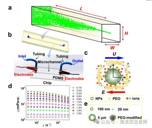 圖1綜合展示了微通道的尺寸設計、微流控芯片的整體結構以及納米顆粒在多物理場控制下的操控原理。其中,微通道為直矩形結構,尺寸參數滿足高通量操作需求;芯片集成有電極和流體通道,用于施加電場和輸送納米顆粒懸浮液。此外,圖中還通過示意圖解釋了納米顆粒在非牛頓流體中受電場和流場耦合作用的遷移機制,以及不同PEO濃度溶液的流變學特性,為后續實驗提供了理論基礎。