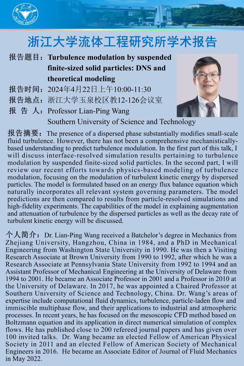 2024.04.22 Turbulence modulation by suspended finite-sized solid particles: DNS and theoretical modeling Lian-Ping Wang 南方科技大學