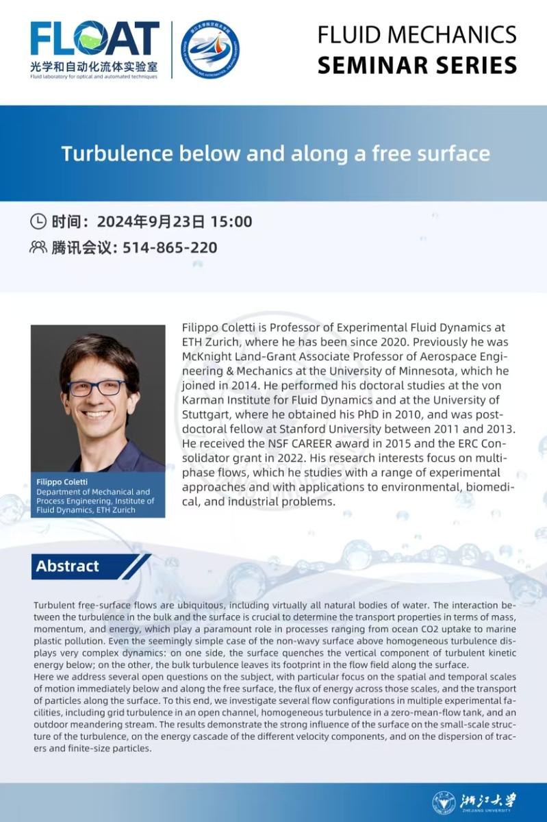 2024.09.23 Turbulence below and along a free surface Filippo Coletti 蘇黎世聯邦理工學院