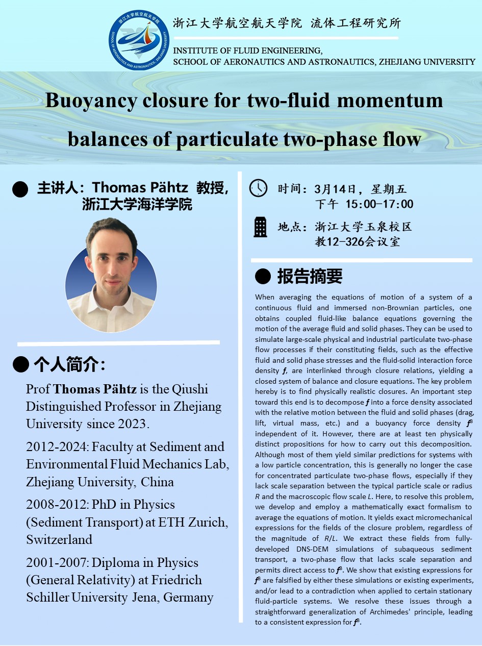 2025.03.14 Buoyancy closure for two-fluid momentum balances of particulate two-phase flow Thomas P?htz教授 浙江大學海洋學院