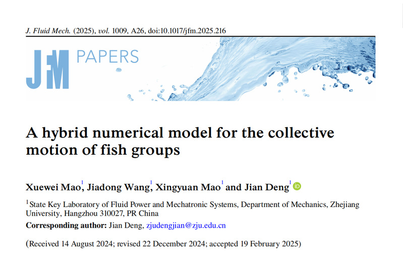 該研究成果以“A hybrid numerical model for the collective motion of fish groups”為題發表在流體力學頂刊Journal of Fluid Mechanics。浙江大學航空航天學院碩士生毛雪維是該文第一作者,鄧見教授是該論文通訊作者。該研究得到了國家自然科學基金資助。 原文鏈接: https://doi.org/10.1017/jfm.2025.216 |