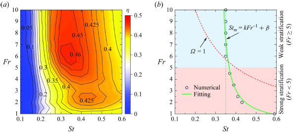 圖4. (a)拍翼推進效率在參數空間(St, Fr)的分布云圖;(b)仿生拍動推進在不同密度分層強度下的最佳斯特勞哈爾數,散點表示數值模擬結果,實線表示理論擬合結果,研究表明最佳斯特勞哈爾數Stm與弗勞德數Fr成反比關系.