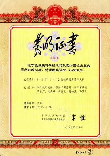 8-09、9-12化鐵爐高壓離心風機 | 國家發(fā)明三等獎 | 沈天耀、崔良成、吳松盛、馮萬文 | 1989 | 國家科學技術委員會 |